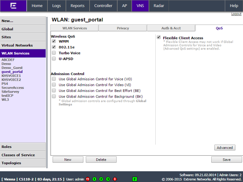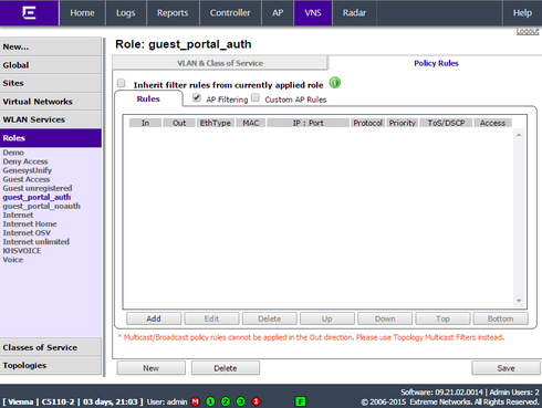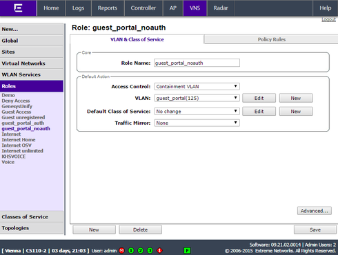 Add a new VNS and select the the "WLAN Service" from 3) and the "Non-Authenticated" and "Authenticated" roles from 2).