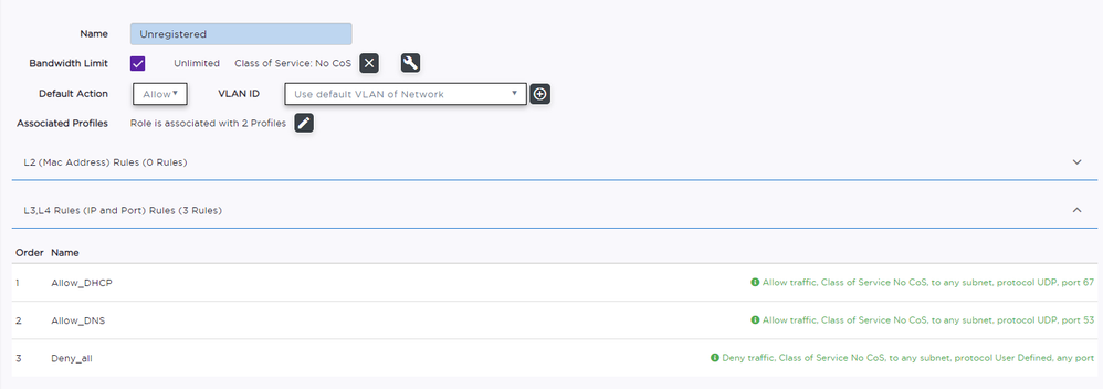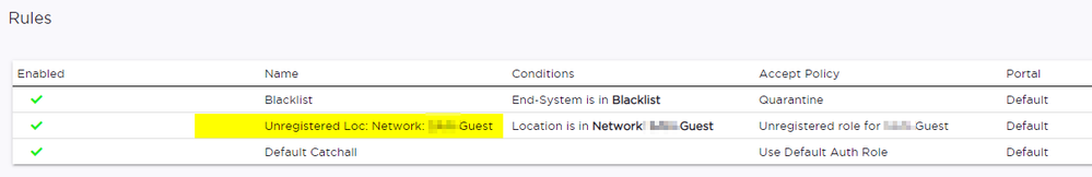 I have tried these rules but they dont seem to have any effect. If I change the default action to deny on the unregistered role they get no access network access at all (i.e. not even captive portal).