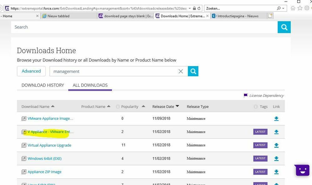 When I want to download the ova files of the nac or xmc, the page stays blank.