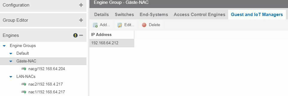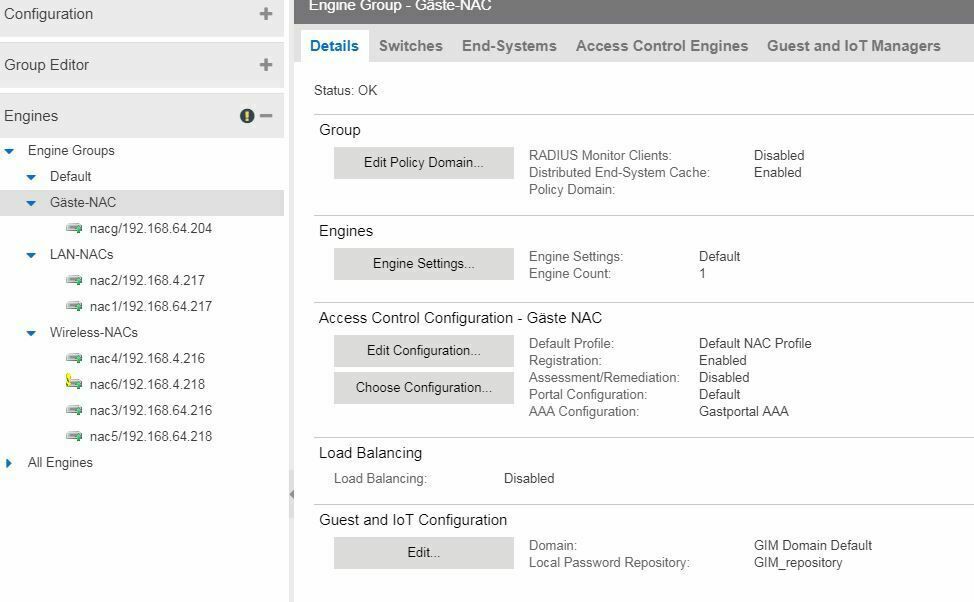 Engine group "Gäste-NAC" has an own AAA configuration ("Gastportal AAA") which puts requests from location GIM to local auth "GIM_repository". I have no LDAP configs there since I test with local reository only.
