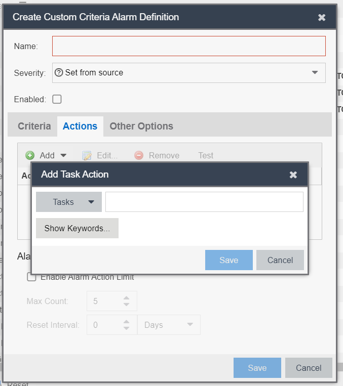 In the alarm creation dialog box under “actions” there is a spot for “add task action” and has a “task” drop down list, however there are only certain system created workflows available in the drop down list.
