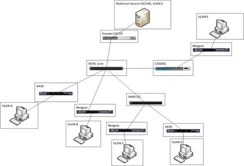 From Source Server (SCCM) in VLAN Z OS images should be deployed to PCs in VLANs A,B,C,D,E. The customer wants to use PIM in Sparse Mode.