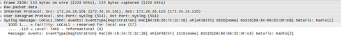 <6>Nov 23 21:15:58 172.24.24.101 events: EventType[Registration] MAC[84:18:26:7C:1C:2B] AP[AP3825i] SSID[Home] BSSID[D8:84:66:02:DF:E8] Details: Radio[2]
