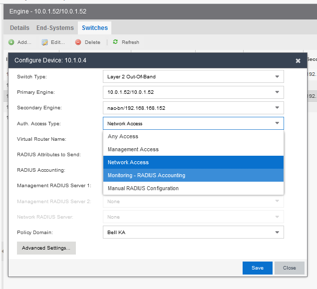 Monitoring - RADIUS Accounting — the switch will monitor Auto Tracking, CEP (Convergence End Point), and Switch Quarantine sessions. ExtremeCloud IQ - Site Engine learns about these session via RADIUS accounting. This allows ExtremeCloud IQ - Site Engine to be in a listen mode, and to display access control, location information, and identity information for end-systems without enabling authentication on the switch. If there are multiple sessions for a single end-system, the session with the highest precedence displays to provide the most accurate access control information for the user. The ExtremeControl authentication type precedence from highest to lowest is: Switch Quarantine, 802.1X, CHAP, PAP, Kerberos, MAC, CEP, RADIUS Snooping, Auto Tracking.
