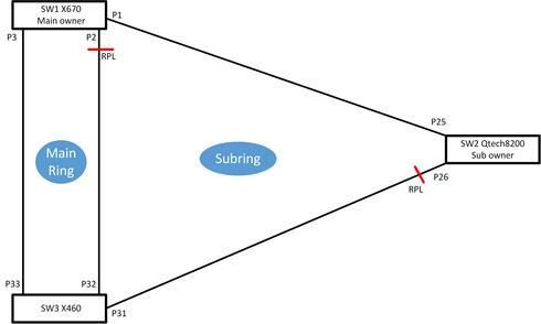 Similarly, if the link between SW1 and SW2 failed, SW1would inform SW2 of the failure through the sub-ring's control VLAN (which happens to go through the main ring). Upon receiving the notification, SW2 would close the RPL port and reestablish connectivity to SW1 and SW3.