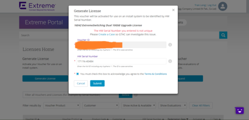 I have X440-G2-24t with S/N 1711N-40484 and Voucher ID : “Dual 10GbE Upgrade License”. I active them in Extreme Portal à Assetsà Generate License but can’t active.