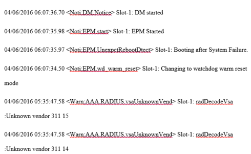 I have a Summit x450e-48p (FW:12.6.3.2) in slot 1 of a stack that reboots (only the one switch, the others remain fine) every morning at 6:07am, the Event Log from ScreenPlay shows the follow every day at this same time (within a handful of seconds or so):