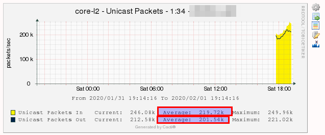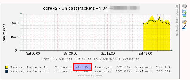 In “dark” screenshots you can see pkts/s from both sides of the same link. Values are almost the same. But in “cacti” screenshot Out value is nearly the same but In is almost twice lower then real.