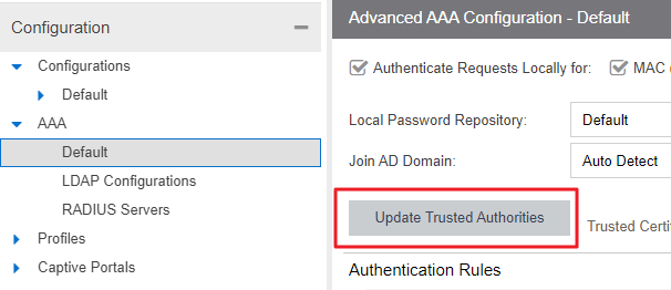 3- Load the CA cert on the āUpdate Trusted Authoritiesā under AAA settings in EAC.