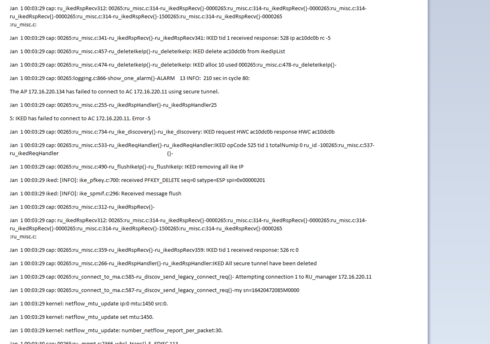 After connecting the AP´s to network they get a DHCP Address from the IPAM System but no regestration and no management possible. i can ping the controlle, the controller can ping the AP and the "controller" is resolvable over DNS. On the same network port .. an other AP works fine so thats no problem with firewall or routing. The Problem is the registration process on the controller i thin. With debug level "Information" the are no entrys about this AP. But into the AP LOG you see some events with IKE and Key and this i not my level of knowlegde about these steps... I have apend the log from the AP.. perhaps someone is here who can read this log . and explan to me what happens there.