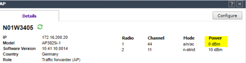 0 dBm!. And the clients can't see the emitted SSID anymore. We use all channels on Radio 1 (5GHz) and the selection is auto. You have to turn Radio 1 off and on to get back the power. The country code is correct and the license is valid. That's all a little bit miserable. Any suggestion how to solve the problem? Green IT?