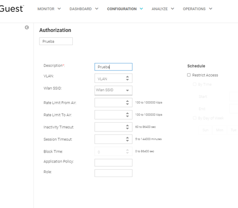 On the VX9000 I can create this policy by pointing to the ip of the ExtremeGuest and configuring a key. But in ExtremeGuest, at the web interface level I do not see where to create the radius. I only have three possible configurations within the AAA section (Autorization, Group and Network). Also within Autorization it indicates that I do not have any WLAN or SSID and it does not let me create it either. In the Wlan SSID drop-down there is nothing.
