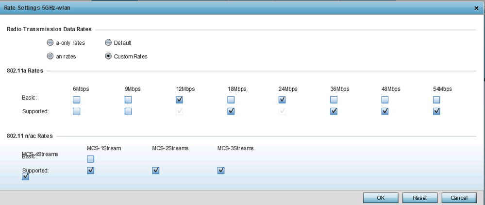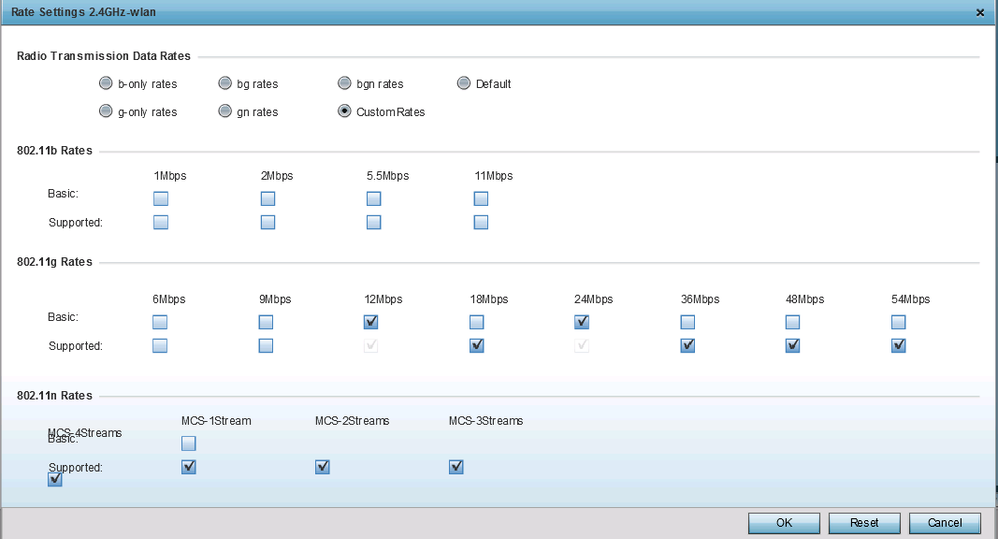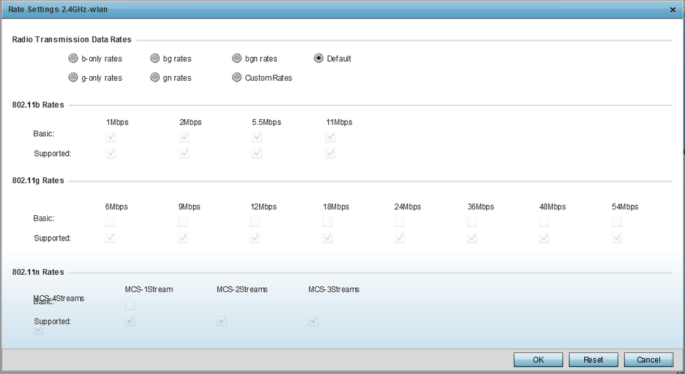 1. Basic RatesThe Basic Rate Set contains the rates that all devices in the cell must support; it is a sub-set of the Transmit Rate Set. All control, multicast, and broadcast packets are transmitted using one of the Basic Rates (as defined by the IEEE 802.11 standards). 2. Supported RatesWith wireless networks, there are many supported speeds depending on the standard of the hardware in use. For example, an 802.11b compliant device supports 11, 5.5, 2, & 1Mbps speeds. This capability information is passed in the beacons to inform the stations what speeds are supported on the access point. 3. Modulation and Coding Scheme (MCS)Modulation and Coding Scheme (MCS) is the quality of the radio channel, and thus the bit rate and robustness of data transmission. The process of link adaptation is a dynamic one and the signal and protocol parameters change as the radio link conditions change.ā10-12-2020 03:54 PM