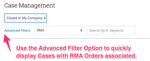 All your RMA(s) will pull up using the "Advanced Filter" option in Case Management. This is easiest way to see the entire list.