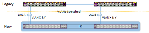 I could equally create a LAG that that goes from one of the legacy cores to each of the new MLAG cores, but in the diagram below I have them directly linked.