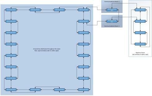 Further than this, the linking (or core switches, as I have labelled them) are each located in an individual communications room with independent power, network paths etc. In the event a comms room loses power or a core switch dies, then both sections will remain connected through the remaining operational switch.